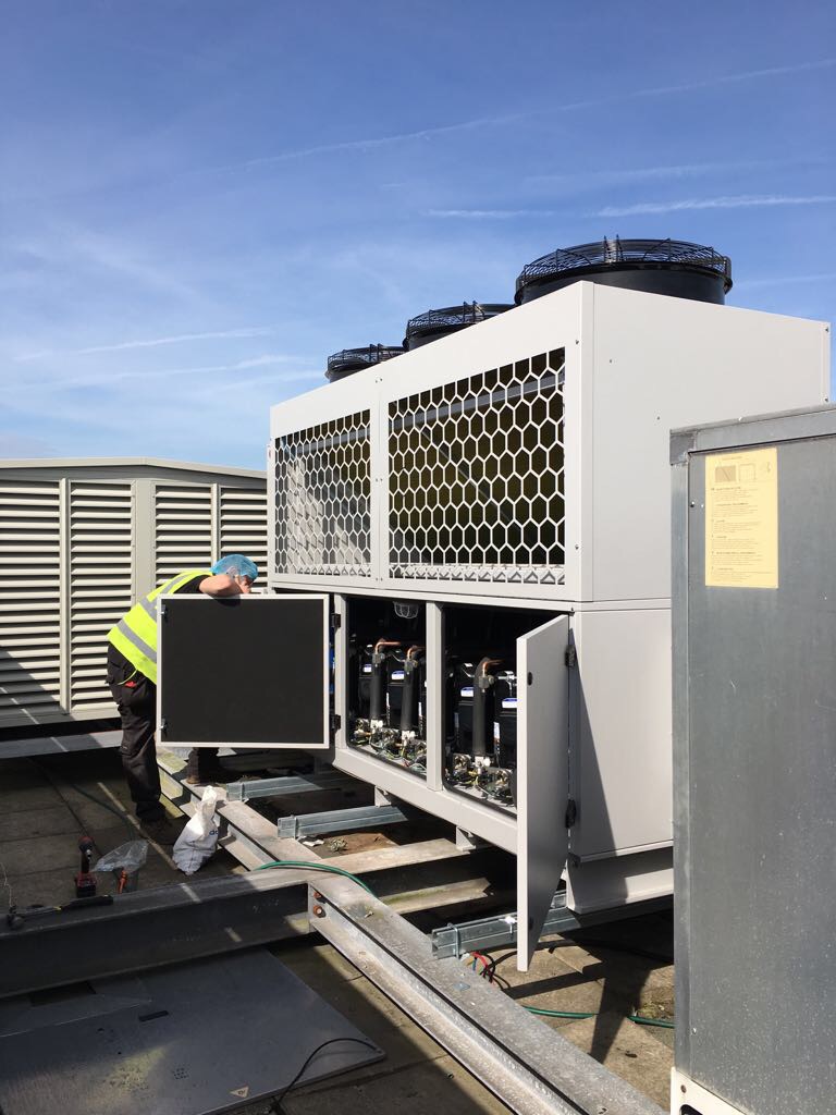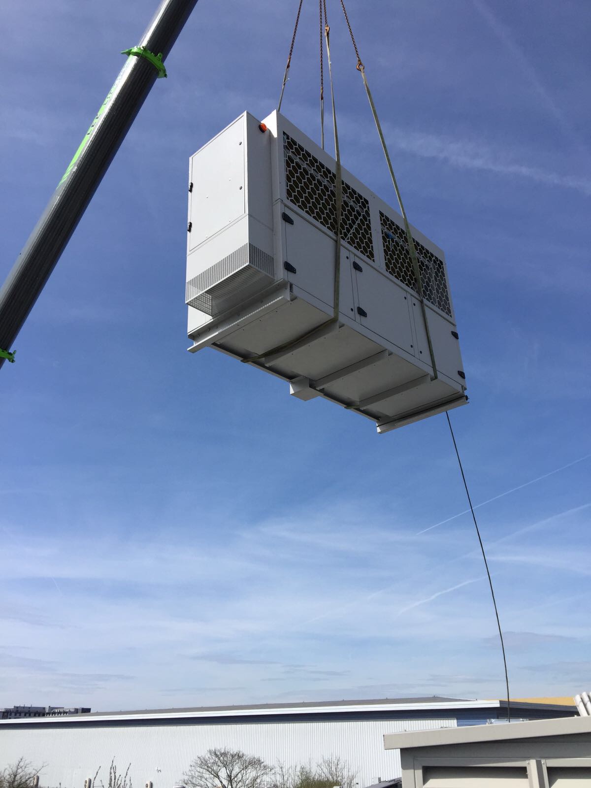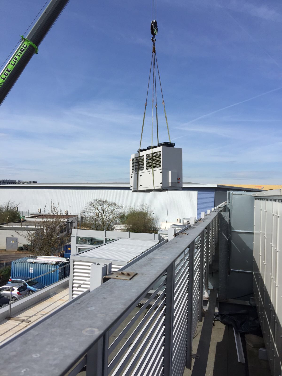New central plant being craned onto roof for ongoing airline catering project in London.